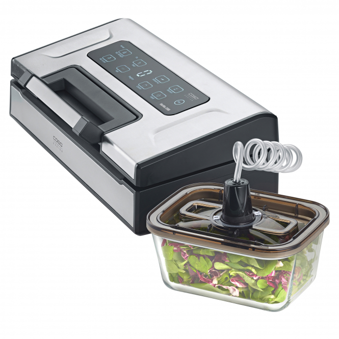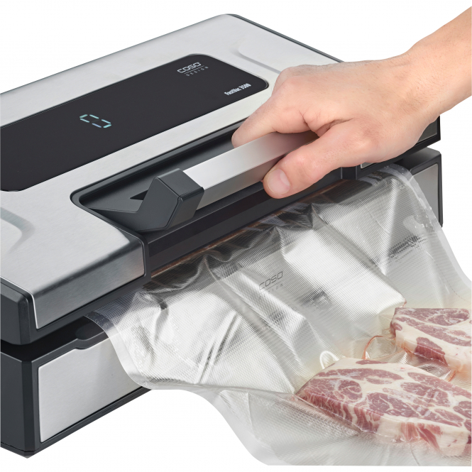 Vakuumiert Flüssigkeiten ohne sie einzusaugen. Mit 2 Schweißzeiten, regulierbarer Vakuumstärke, manuelles Schweißen, Stopptaste. Bis 35 cm Breite. Mit zweitem Stecker für den 12V-Anschluss im Auto. Maße: 45,0 x 20,6 x 12,9 cm. Gewicht: 3,7 kg. Inkl. Vakuumrolle 35 x 800 cm, 10 versch. Vakuumbeutel (5 x 20x30 cm, 5 x 30x40 cm) und CASO Food Manager Sticker.
